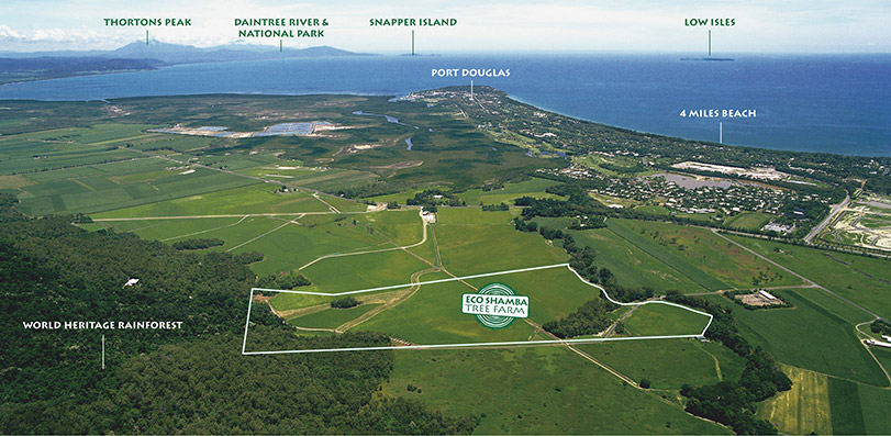 ECO SHAMBA Tree Farm was established in August 2009 as an environmental initiative. The location of suitable, high productive land was searched for. The investment and long term commitment was established on 27 Hectares (68 acres) of land, ex cane paddocks close to Port Douglas, adjacent to World Heritage Rainforest and boarding Crees Creek.